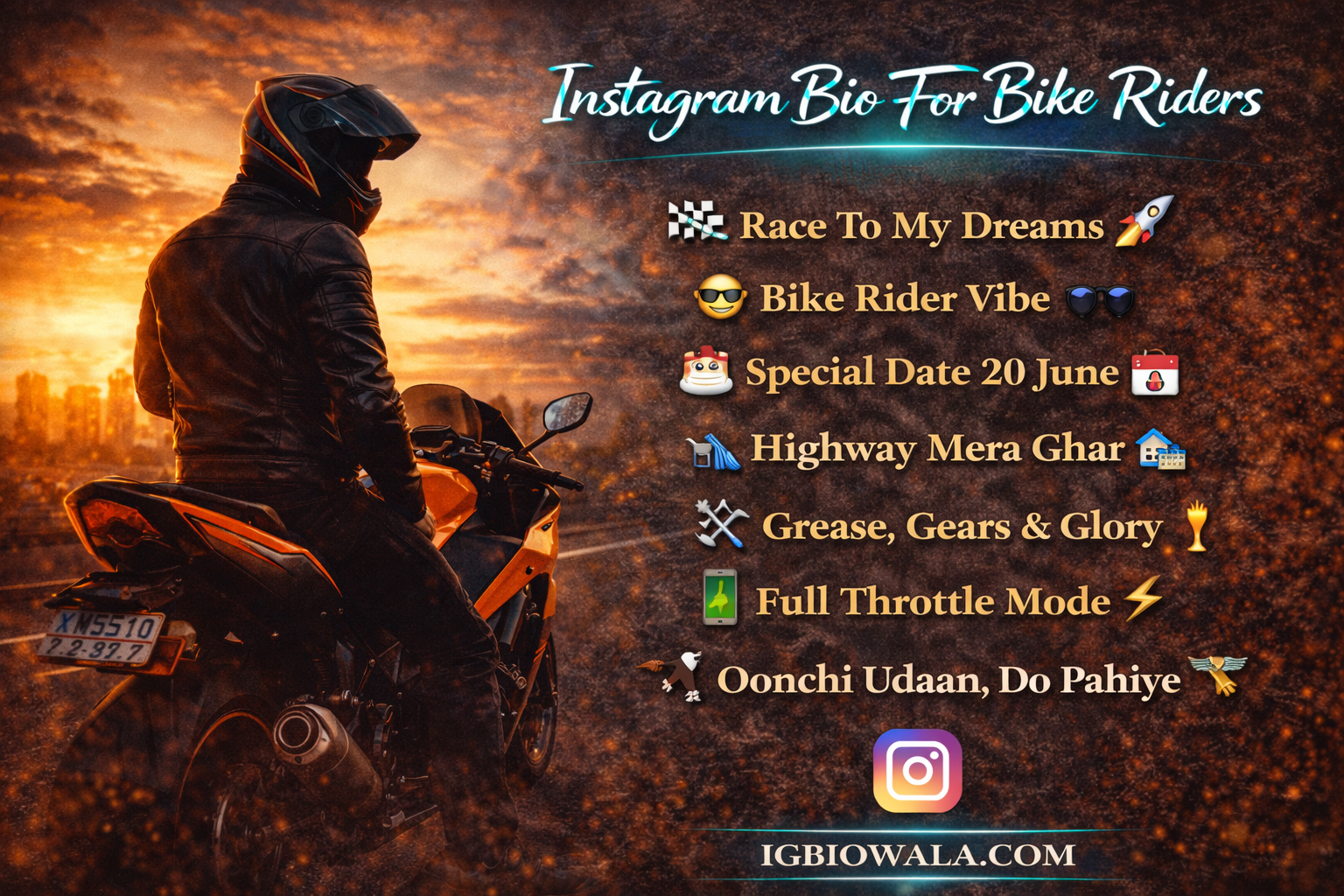 Welcome To igbiowala.com The Best Place To Find Stylish And Passionate Instagram Bio For Bike Riders. If You Want To Show Your Love For Riding, Speed, And Adventure Through Your Profile, You Are At The Right Place. Here, We Have Shared The Best Bike Rider Bios That Reflect Freedom, Thrill, And A Riderโ€™s Lifestyle. You Can Easily Copy These Bios And Use Them On Instagram, WhatsApp, Or Facebook To Make Your Profile Look Cool And Adventurous.